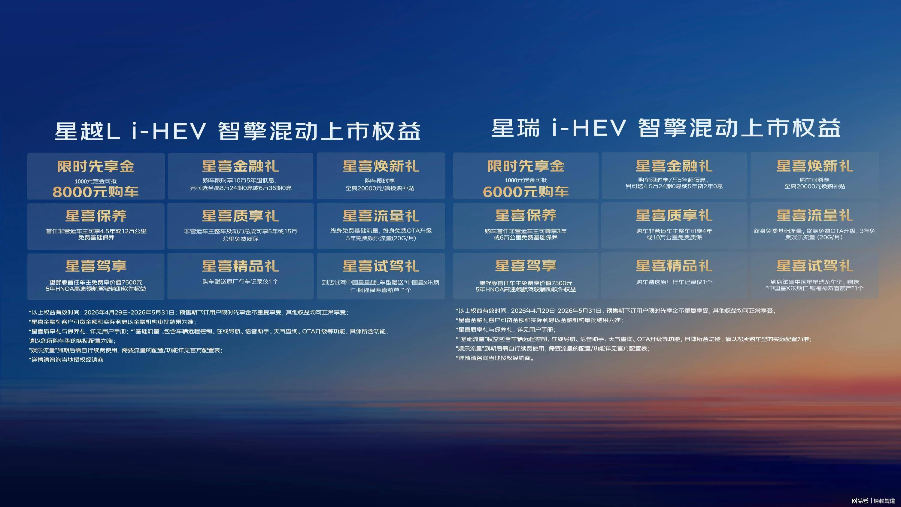2026年4月29日,吉利中国星i-HEV智擎混动家族于杭州正式发布,星瑞、星越L两款混动新车同步登场。其中星瑞i-HEV智擎混动限时定价9.67万—10.87万元,星越L i-HEV智擎混动限时售价13.07万—14.47万元。